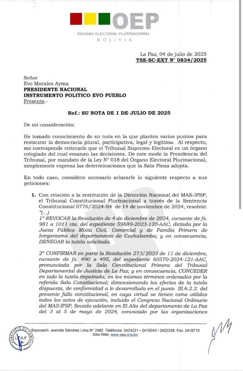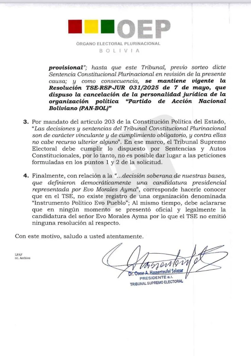 El Tribunal Supremo Electoral (TSE) respondió a una nota que le envió el expresidente Evo Morales en la que solicitaba restituir la dirección del MAS a las bases, reponer la personería jurídica de Pan-Bol y “respetar la decisión soberana de las bases”, que proponen al líder cocalero como “único candidato” a la presidencia. El TSE señala que “debe cumplir lo dispuesto por sentencias y autos constitucionales, por lo tanto, no es posible dar lugar a las peticiones formuladas”.