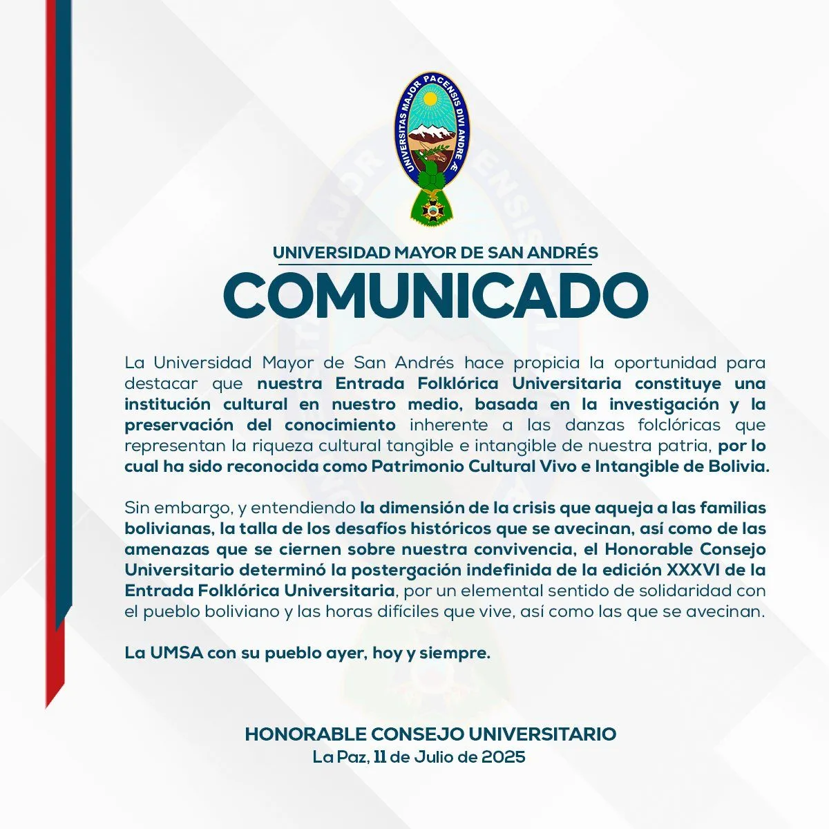 “El Honorable Consejo Universitario determinó la postergación indefinida de la edición XXXVI de la Entrada Folklórica Universitaria, por un elemental sentido de solidaridad con el pueblo boliviano y las horas difíciles que vive, así como las que se avecinan”, señala un comunicado público de la casa de estudios superiores de La Paz.