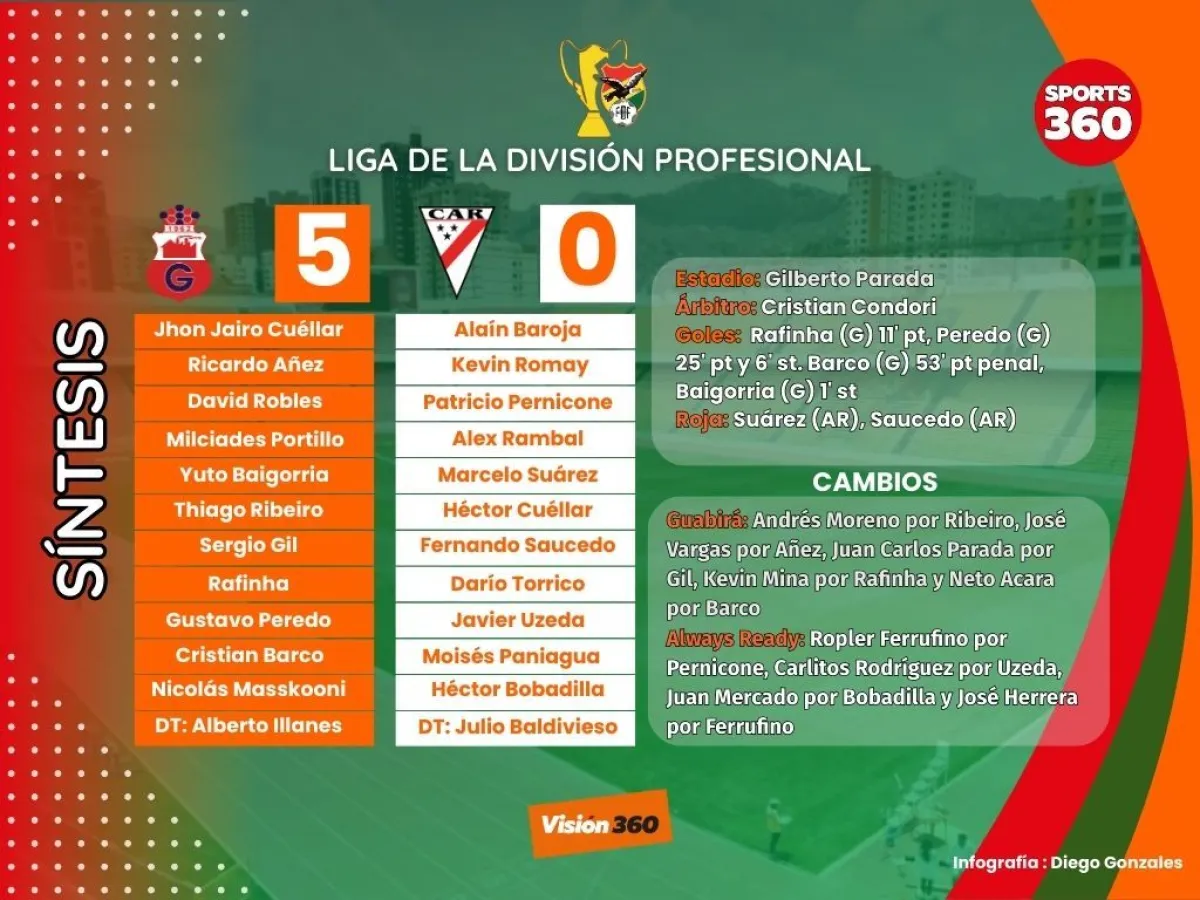 Guabirá dio fin esta noche al último invicto del torneo, Always Ready, al que goleó por 5-0 en la peor actuación que tuvo el elenco alteño que jugó todo el segundo tiempo con nueve hombres por la expulsión de Marcelo Suárez y Fernando Saucedo.
