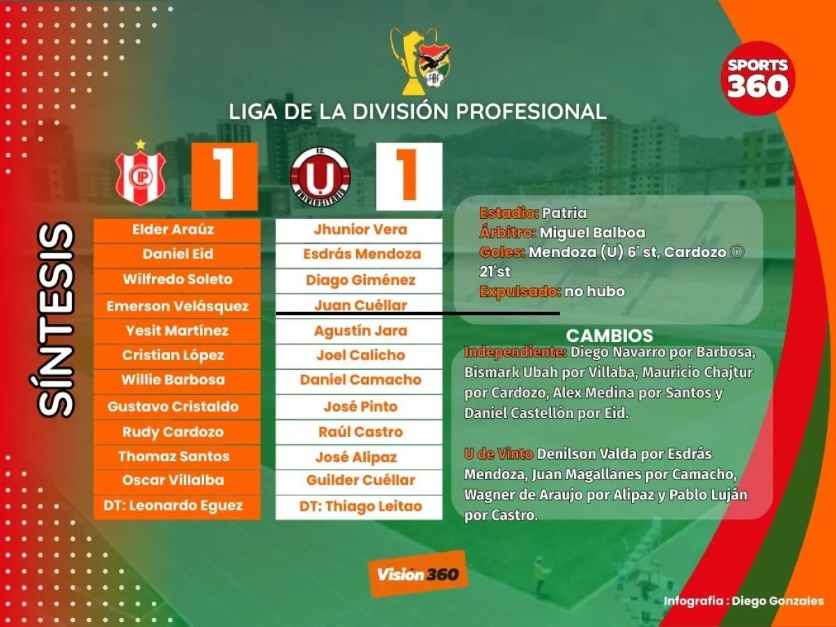 En los minutos finales, Cristaldo estrelló el balón en el poste izquierdo de la U de Vinto y el partido concluyó emparejado a un gol.