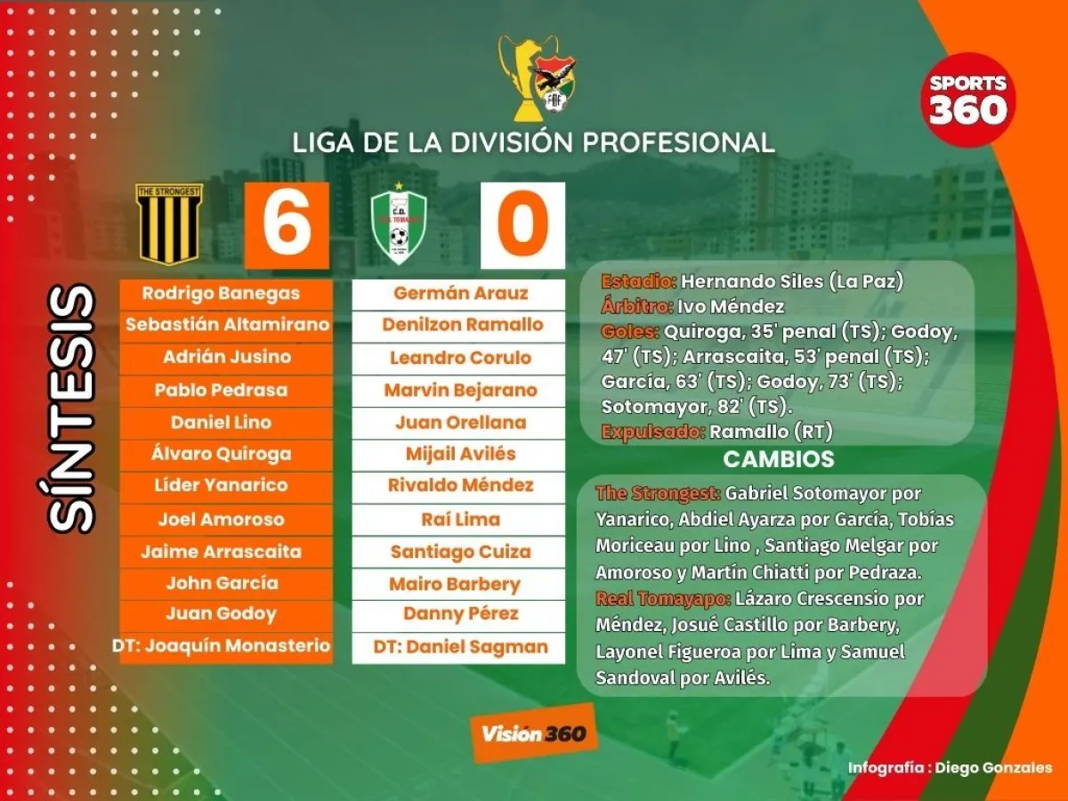 The Strongest goleó por 6 a 0 a Real Tomayapo de Tarija en el estadio Hernando Siles y alcanzó en la cima de la Liga de la División Profesional a Always Ready, que el sábado perdió el invicto tras su derrota con Guabirá (5-0).