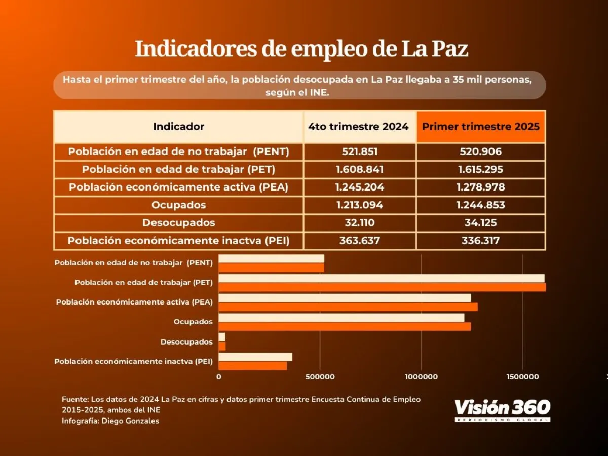 Cifras del Instituto Nacional de Estadística (INE) revelan que, al primer trimestre de 2025, la población económicamente activa (PEA) llegó a 1.278.978 personas, de las cuales estaban ocupadas 1.244.853 y los desocupados sumaban 34.125 personas. Este último número representa un incremento respecto a las 32.110 personas que estaban sin empleo hasta el cuarto trimestre de 2024.