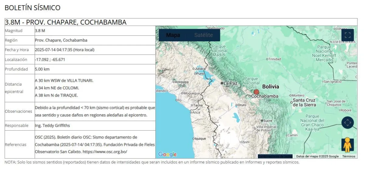 “El día 14 de julio de 2025 a horas 04.17 se registró un evento de magnitud 3,8 M, a una profundidad hipocentral de 5.0 kilómetros, sismo superficial”, informó la red dismológica del Observatorio San Calixto.