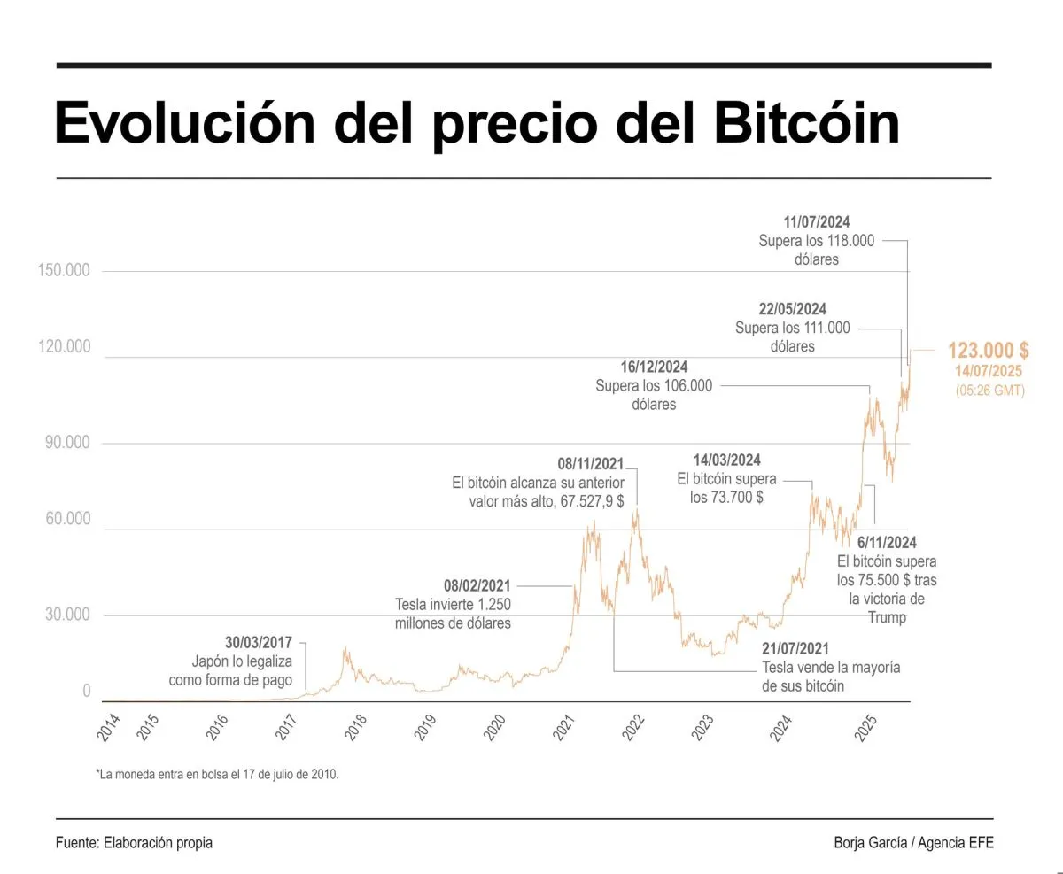 El bitcoin alcanzó un nuevo máximo histórico al superar los 123.000 dólares este lunes y ha estrenado así la semana denominada como "de las criptomonedas", en la que los líderes de la Cámara de Representantes de Estados Unidos debatirán varios proyectos de ley relacionados con estos criptoactivos.