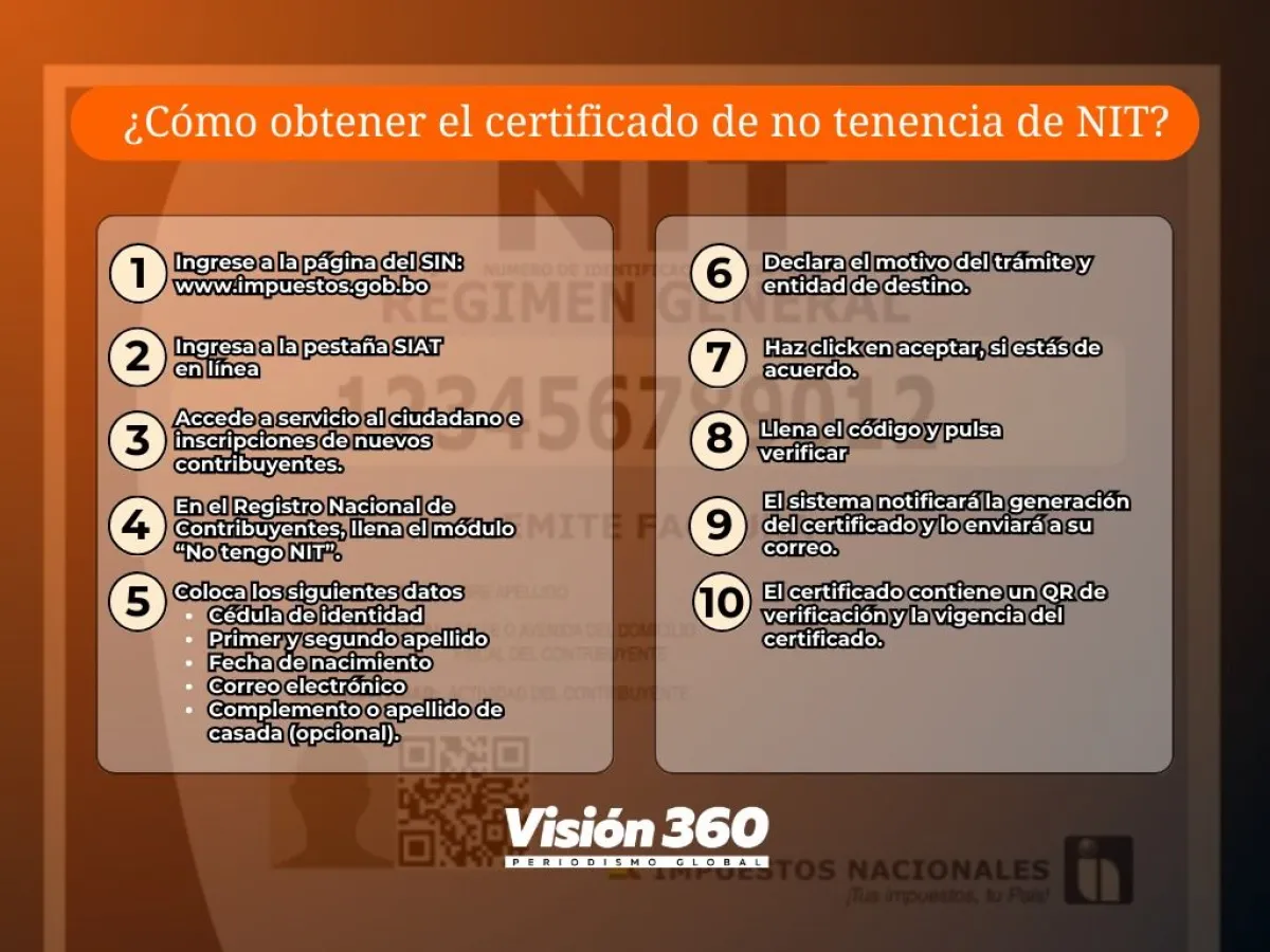 Si alguna entidad le solicita el certificado de no tenencia de NIT (Número de Identificación Tributaria) o simplemente quiere contar con este documento para comprobar que nadie lo sacó a su nombre, para cualquier trámite futuro o evitar cobros de impuestos, el mismo lo puede obtener en minutos en línea a través del Sistema Integrado de Administración Tributaria (Siat).