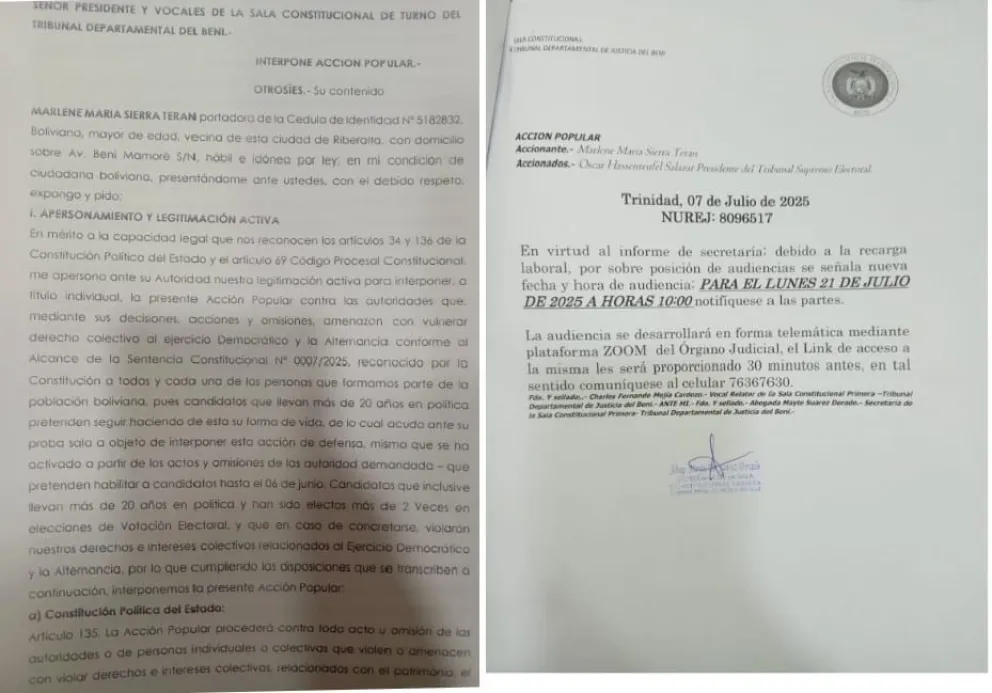 De acuerdo con la información la ciudadana Marlene María Sierra Terán presentó la acción popular ante la Sala Constitucional del Beni y en su memorial solicitó la inhabilitación de los candidatos que hayan ejercido cargos públicos durante un periodo acumulado de 10 años, es decir, aquellos que fueron electos mediante sufragio en dos gestiones consecutivas.