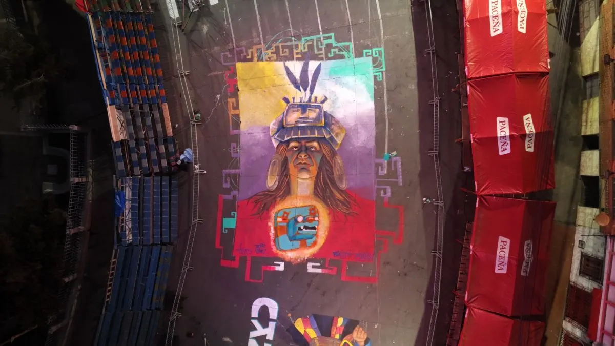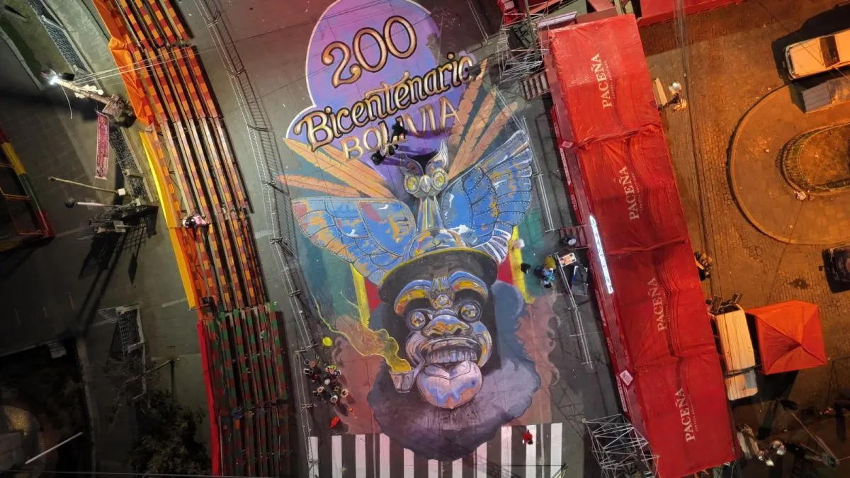 “Los lienzos elaborados la madrugada de este martes a lo largo del recorrido de la entrada exhiben figuras de personajes de las danzas pesadas, livianas y autóctonas, pero además la alusión a los 200 años que cumple Bolivia”, dice la Alcaldía de El Alto.