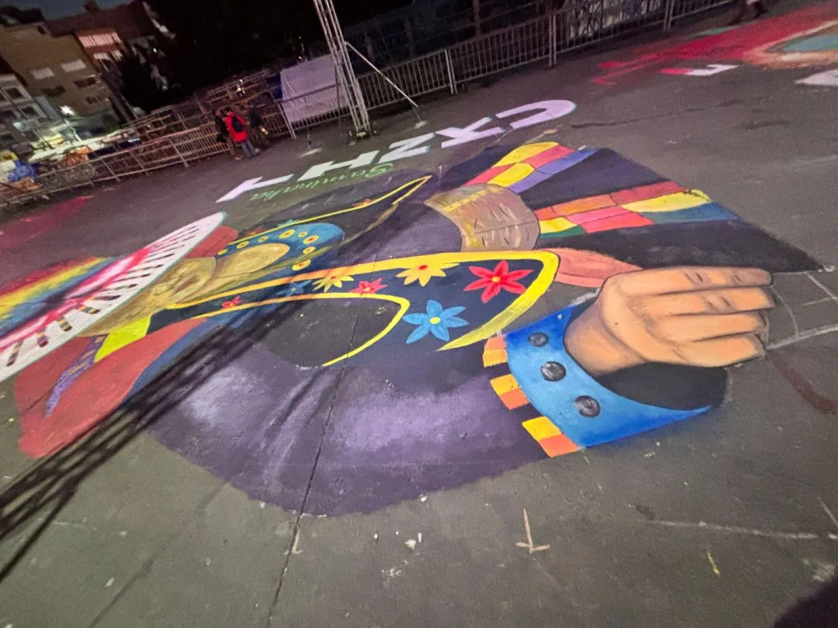 Murales pintados en el pavimento de la avenida Alfonso Ugarte y plaza de la Libertad, por donde más de 20 mil fraternos bailarán este martes 15  en la 41 entrada en devoción a la Virgen del Carmen en el El Alto muestran la riqueza folklórica en el año del Bicentenario de Bolivia.