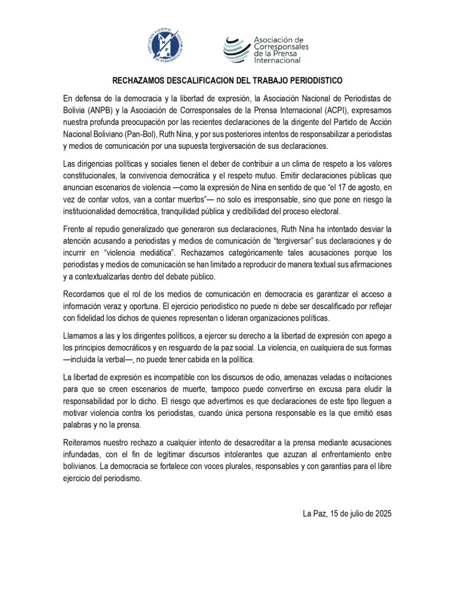La Asociación Nacional de Periodistas de Bolivia (ANPB) y la Asociación de Corresponsales de la Prensa Internacional (ACPI), expresaron “profunda preocupación” por las recientes declaraciones de la dirigente de Pan-Bol, Ruth Nina, y por sus posteriores intentos de responsabilizar a periodistas y medios de comunicación por una supuesta tergiversación de sus declaraciones.