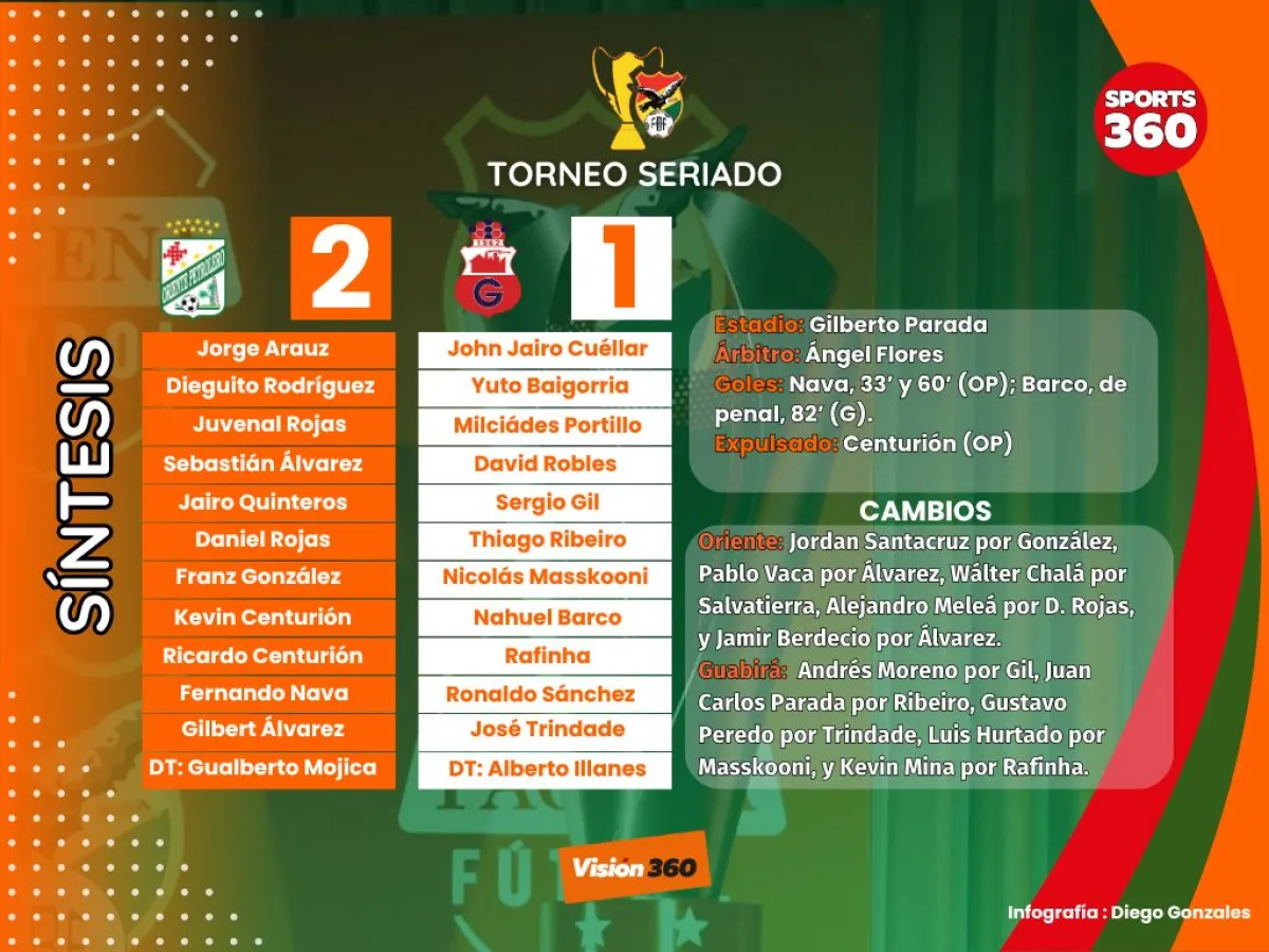 Oriente Petrolero llegó al primer lugar de las posiciones del Grupo D de la Copa Bolivia con su victoria 2-1 sobre Guabirá, este miércoles en el estadio Gilberto Parada de Montero.