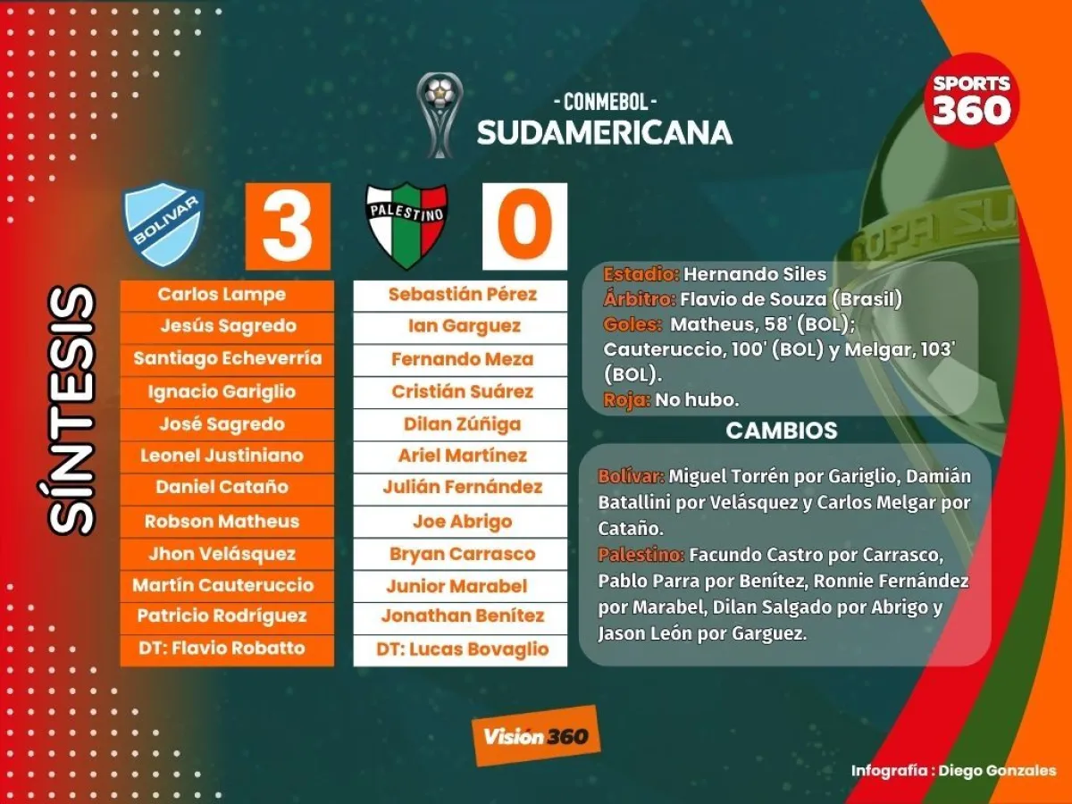 Bolívar venció al chileno Palestino (3-0) gracias a los tantos de Robson Matheus, Martín Cauteruccio y Carlos Melgar, este miércoles en el estadio Hernando Siles, y sacó una buena diferencia para ir a la vuelta de los Play-Offs de la Copa Sudamericana.