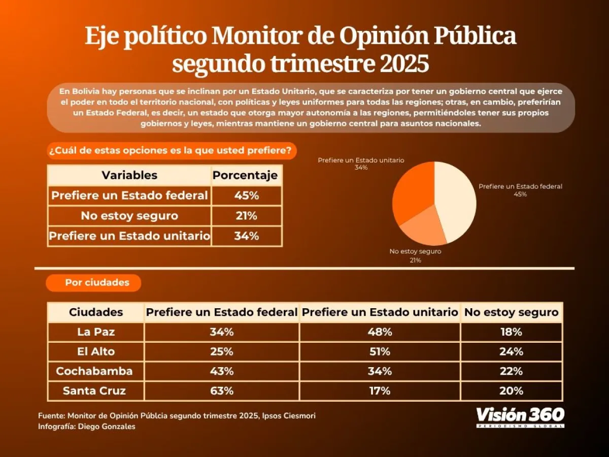 Un 45% de los bolivianos respalda o expresa preferencia por un Estado Federal, por encima del actual esquema de Estado unitario, según revela el Monitor de Opinión Pública segundo trimestre 2025, elaborado por Ipsos Ciesmori. Quienes  más se inclinan por esta opción son los cruceños, donde el 63% apoya esta opción, a diferencia de los alteños, ya que el 51% prefiere un Estado unitario.