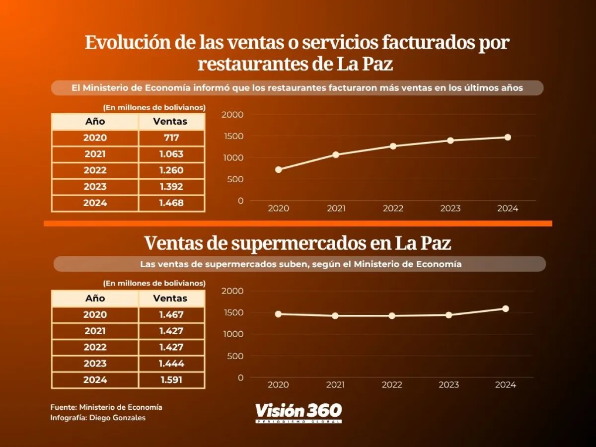 “El consumo facturado en restaurantes del departamento de La Paz mostró un crecimiento sostenido entre 2020 y 2024. Durante este período, los ingresos pasaron de 717 millones de bolivianos en 2020 a 1.468 millones de bolivianos en 2024. Además, se observó un incremento del 5,5% en 2024, respecto al año anterior, consolidando una tendencia positiva en el sector”, asegura esa cartera de Estado.