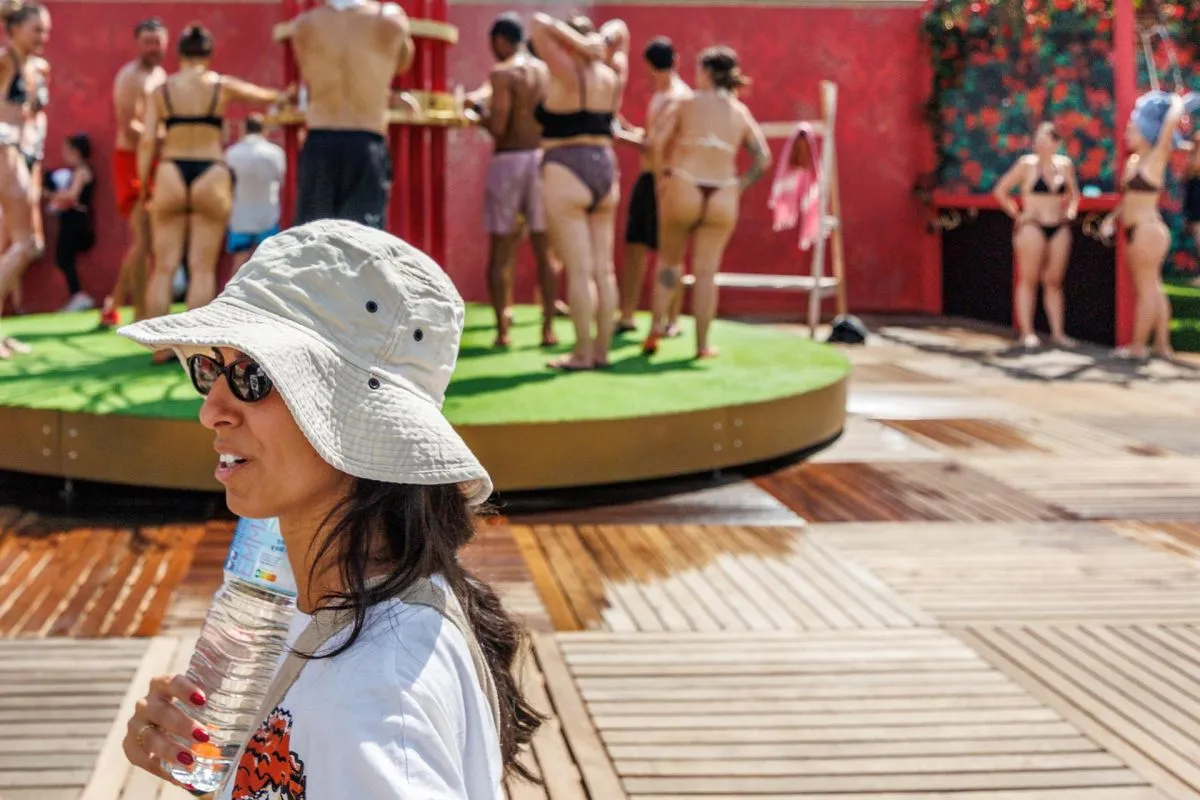 Desfilando hacia el primer control de pulseras que acreditan la entrada al festival y entre grupos de gente vestida con ropa veraniega, disfraces y mucha purpurina, se encuentran Shivani y Dev.