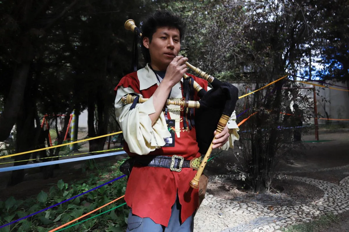 Un hombre toca una gaita durante el festival 'Muy, Muy Lejano' este sábado en el Parque de las Culturas y de la Madre Tierra en La Paz (Bolivia). EFE