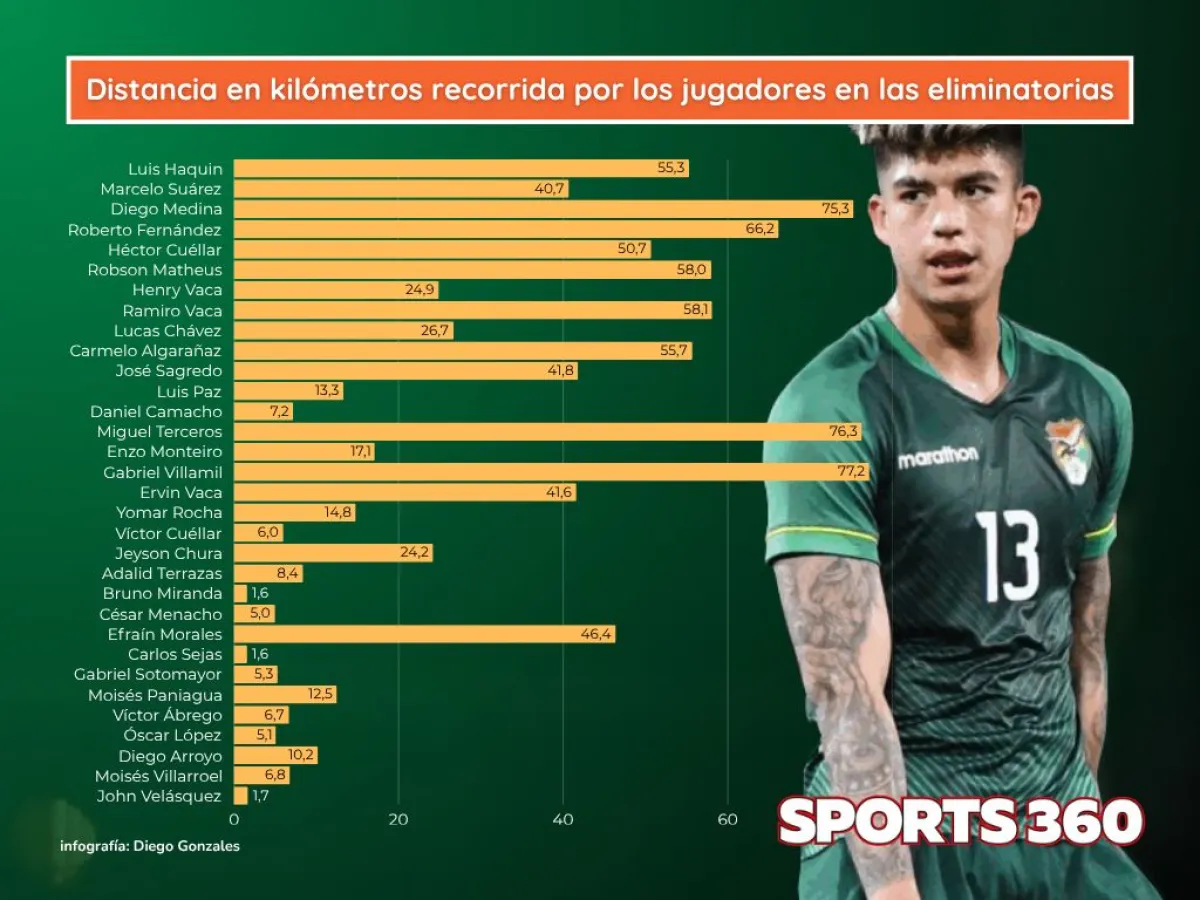 Gabriel Villamil, mediocampista del ecuatoriano Liga Deportiva Universitaria de Quito, es el futbolista que más kilómetros corrió en nueve cotejos por eliminatorias en los que fue utilizado con 77,2 kilómetros, según la medición realizada por el cuerpo técnico de la Selección nacional desde la llegada a la dirección técnica hace un año de Óscar Villegas.