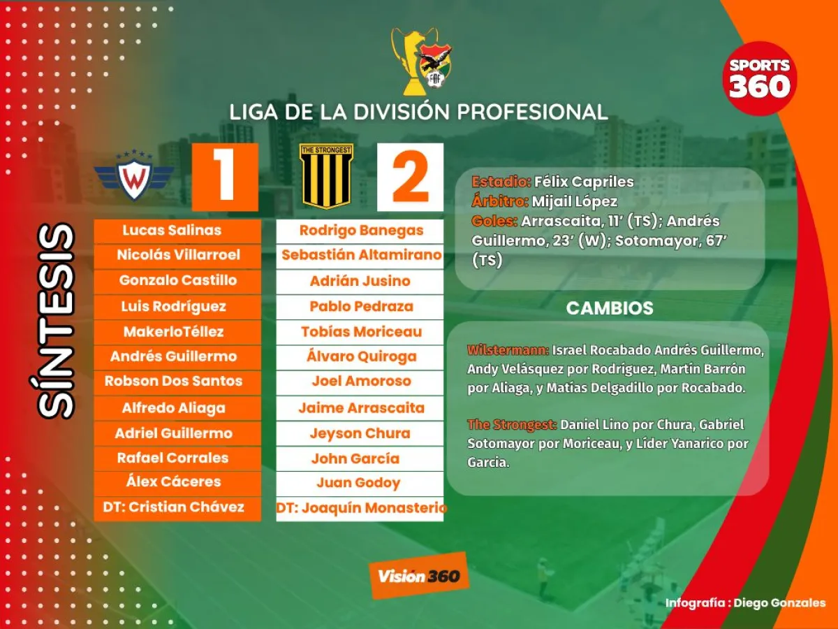 Con el sufrido triunfo 1-2 sobre Wilstermann este domingo en el estadio Félix Capriles de Cochabamba, The Strongest mantiene la pulseta con Always Ready por el primer lugar de las posiciones del torneo Liga de la División Profesional.
