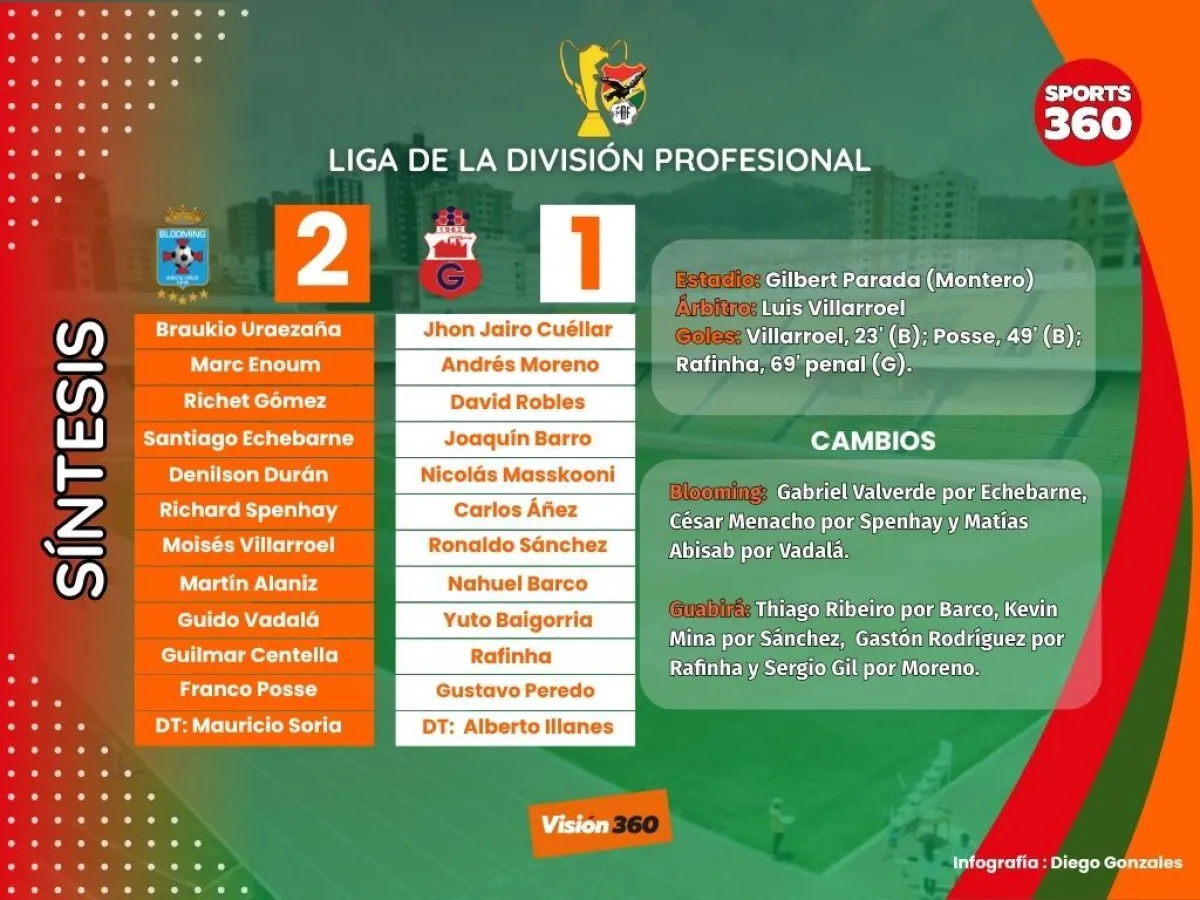 Blooming recuperó el tercer lugar de la tabla de posiciones de la Liga de la División Profesional tras ganarle (2-1) a Guabirá en Montero, partido de la jornada 15.