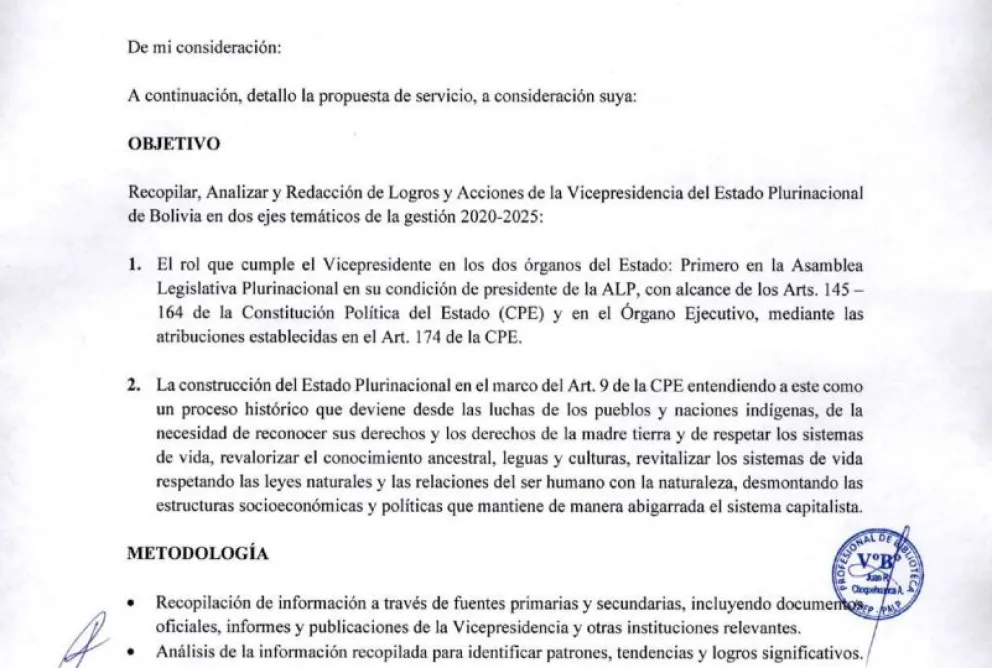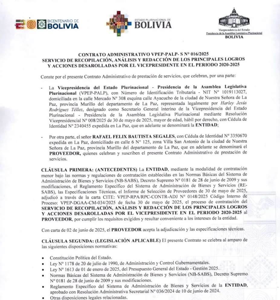 “El objeto y causa del presente contrato es la prestación del Servicio de Recopilación, Análisis y Redacción de los Principales Logros y Acciones Desarrolladas por el Vicepresidente en el Periodo 2020-2025 para la Vicepresidencia del Estado Plurinacional - Presidencia de la Asamblea Legislativa (VPEP-PALP)”, se lee en el contrato.