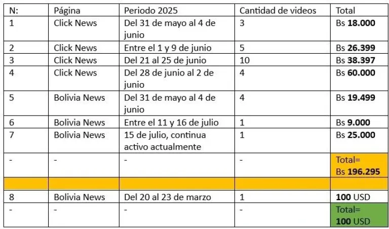 La publicación fue direccionada para que aparezca como publicidad en tres departamentos: La Paz, Santa Cruz y Tarija. Los anuncios fueron difundido entre el 31 de mayo y el 4 de junio de 2025, con un presupuesto de Bs 6.000 por video, haciéndose un total de Bs 18.000.