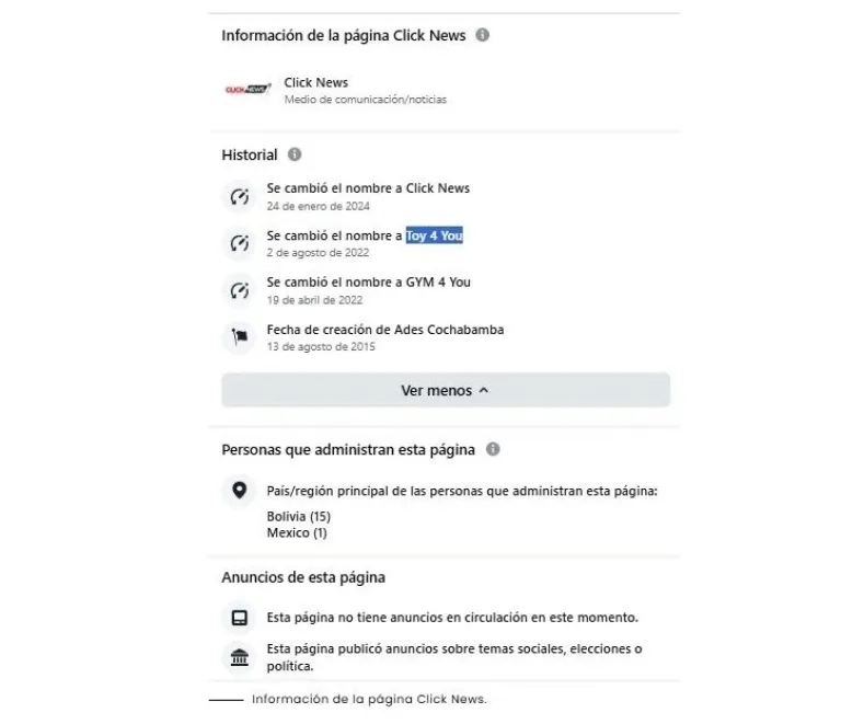 Al igual que Clic News, esta cuenta también es manejada desde Bolivia (10) y México (2). Según la información disponible, opera desde Santa Cruz de la Sierra, sin embargo, sus anuncios son pagados desde la ciudad de Cochabamba.