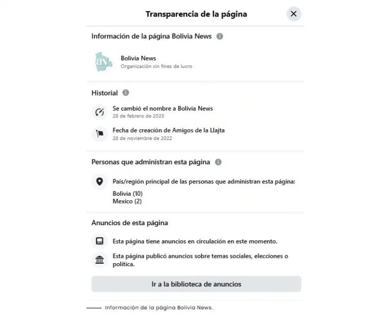 Bolivia News se identifica como una “organización sin fines de lucro” y fue creada el 28 de noviembre de 2022 bajo el nombre “Amigos de la Llajta”. El 28 de febrero de 2025, fue renombrada a su denominación actual.
