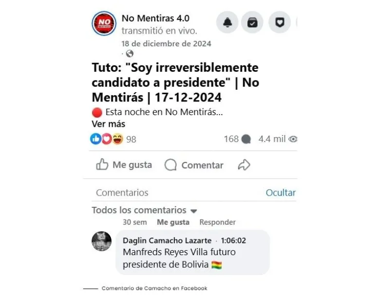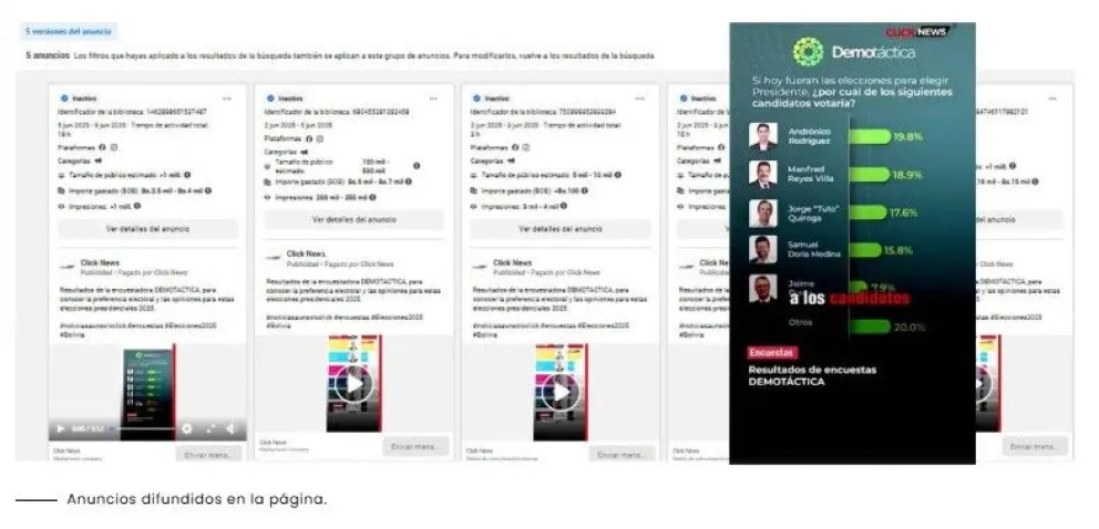 Los desinformantes usan las páginas Click News y Bolivia News para promocionar videos falsos. Las cuentas se administran desde México y Bolivia y en varios casos difunden contenido favorable a Manfred Reyes Villa.