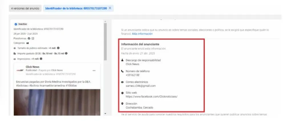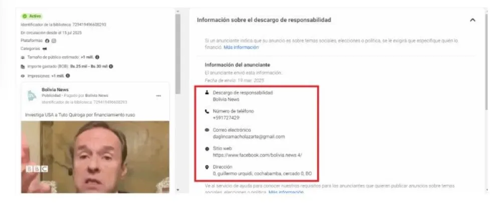 Según el registro de la Biblioteca de Anuncios de Meta de la página Bolivia News, la persona que realiza este pago es Daglin Camacho Lazarte. En el descargo de responsabilidad señala su número de teléfono, correo electrónico y ciudad desde donde se registró, que en este caso es Cochabamba.