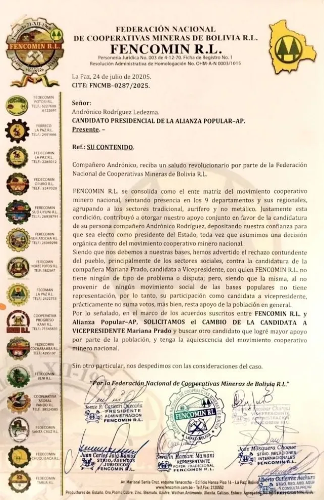 “Solicitamos el cambio de la candidata a vicepresidente Mariana Prado y buscar otro candidato que logre mayor apoyo por parte de la población y tenga la aquiescencia del movimiento cooperativo minero nacional”, señala la misiva firmada por la directiva de Fencomin y enviada el 24 de julio de 2025.
