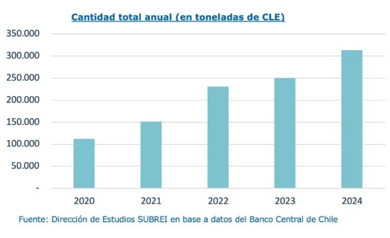 El informe dice que el volumen exportado por Chile alcanzó un récord de 314.000 toneladas de Carbonato de Litio Equivalente (CLE) en 2024, reflejando la creciente capacidad productiva del país y su adaptación a las condiciones del mercado. «Lo anterior implica un crecimiento del 26% respecto del año anterior y un alza promedio anual de 29% en los últimos cuatro años», añade el documento.