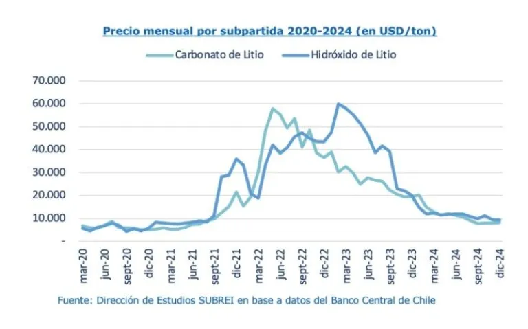 Esta diferencia se explica por una significativa caída en el precio del Carbonato de Litio Equivalente (CLE): de 58.000 dólares por tonelada en 2022 y 60.000 dólares en 2023, el precio descendió drásticamente a 10.000 dólares en 2024.