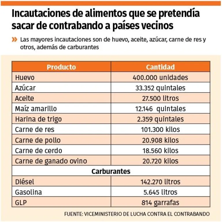 Las mayores incautaciones de productos que se  pretendía sacar de Bolivia son de huevo, harina, aceite, azúcar y carne (res, pollo, cerdo y ovina); además de combustibles, como gasolina, diésel y gas licuado de petróleo, según el Viceministerio de Lucha Contra el Contrabando (ver cuadro adjunto).