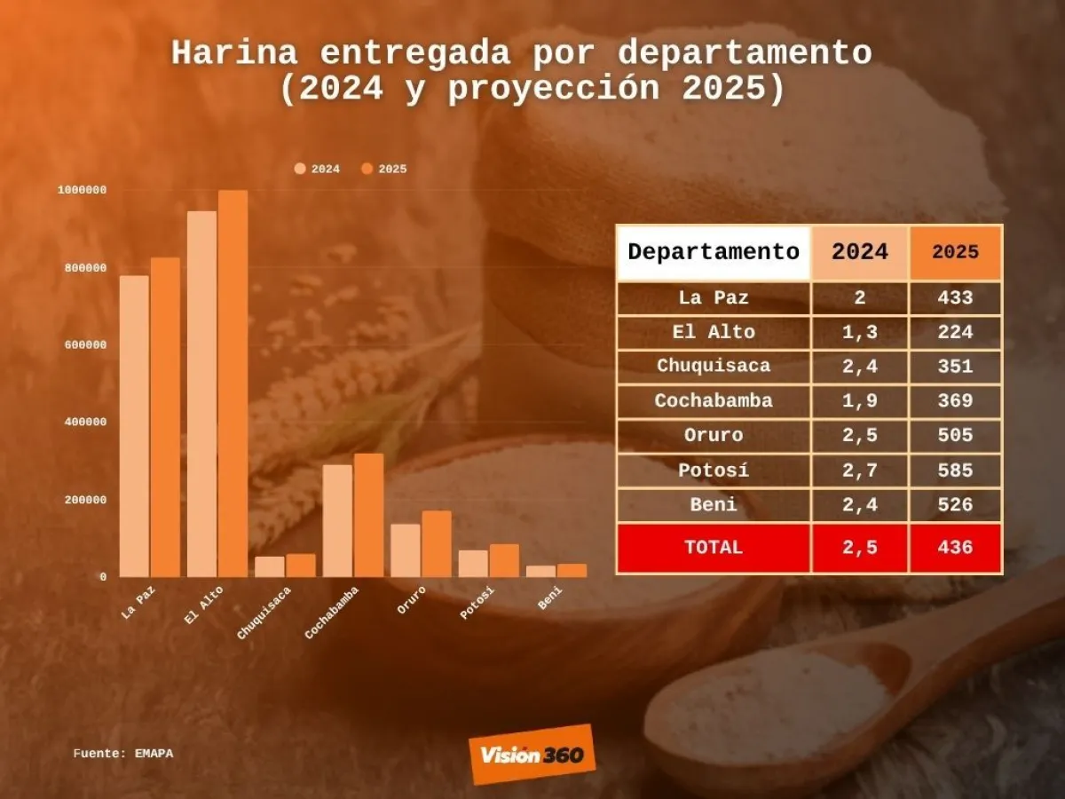 Para este año, Emapa garantizó la provisión de 2.495.392 de bolsas de 50 kilos de harina, superior a las 2.305.205 bolsas del año pasado. Para La Paz, este año, se programó la entrega de 825.713 bolsas; para El Alto, 999.205 bolsas; para Chuquisaca, 60.018 bolsas; para Cochabamba, 320.458 bolsas; para Oruro, 171.129 bolsas; para Potosí, 85.043 bolsas y para Beni, 33.825 bolsas.