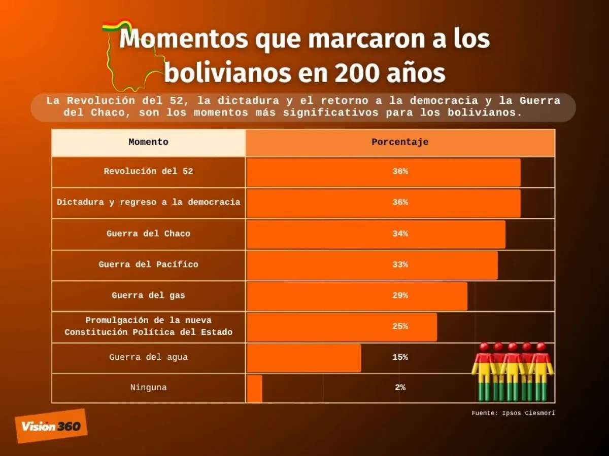 Para los bolivianos encuestados, los momentos más significativos de la historia del país fueron, en primer lugar, la Revolución de 1952 y el periodo de dictadura seguido por el retorno a la democracia, según revela una encuesta de Ipsos Ciesmori a propósito del Bicentenario de Bolivia. Además, Marcelo Quiroga Santa Cruz y Carlos Palenque aparecen como las figuras históricas más influyentes a seguir.