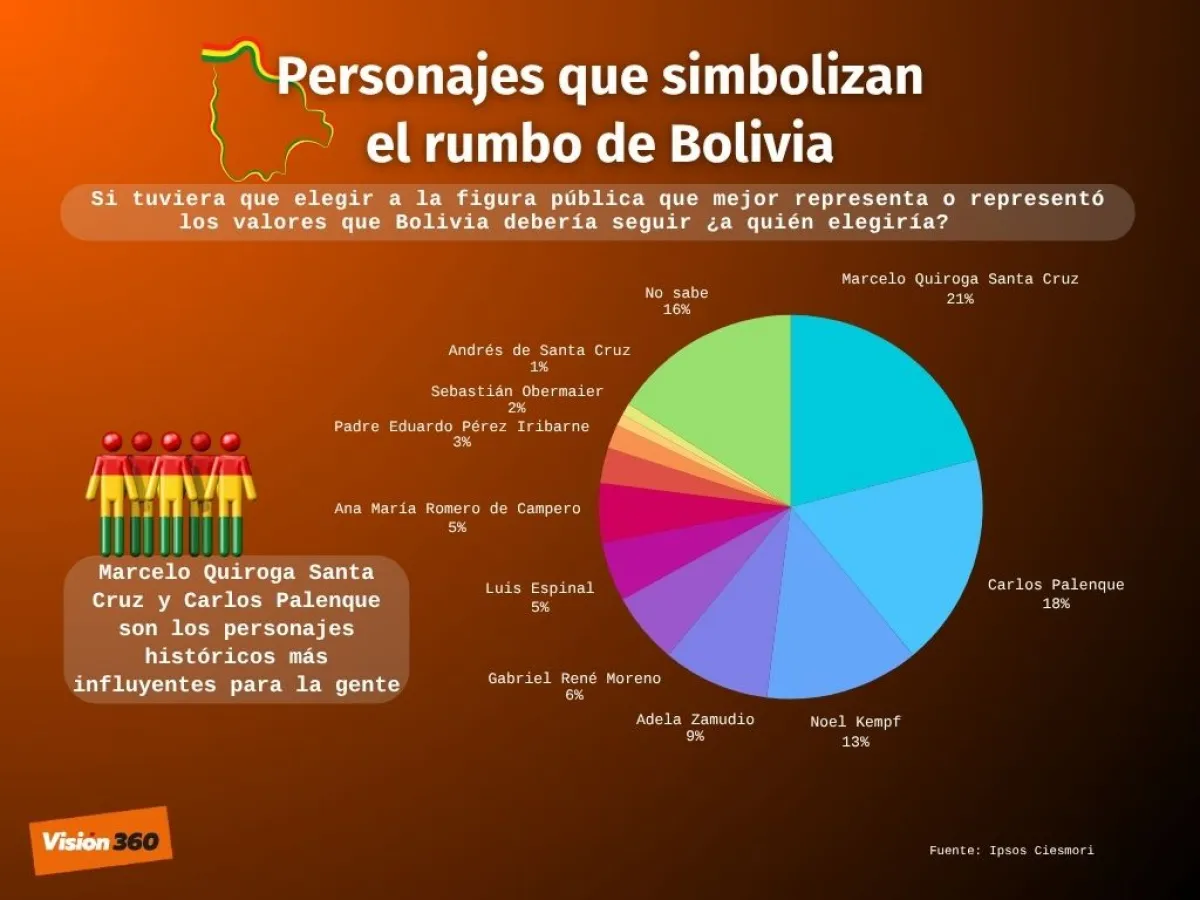 Marcelo Quiroga Santa Cruz (21%) y Carlos Palenque (18%) emergen como las figuras históricas más influyentes y representan una preferencia por liderazgos con fuertes tintes políticos y sociales. Además, superan ampliamente a otras figuras culturales, intelectuales y religiosas, según los resultados del estudio.