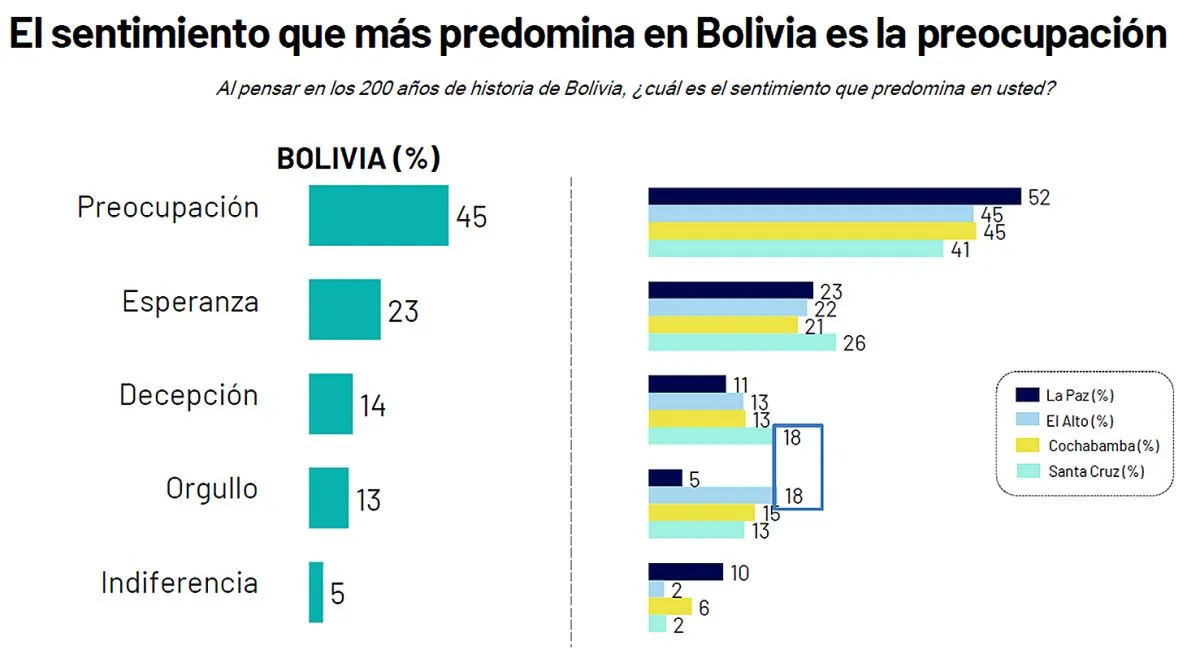 En La Paz es donde existe la mayor percepción de preocupación (52%), seguida de El Alto y Cochabamba (45%) y Santa Cruz (41%). La "esperanza" es mayor en Santa Cruz (26%).