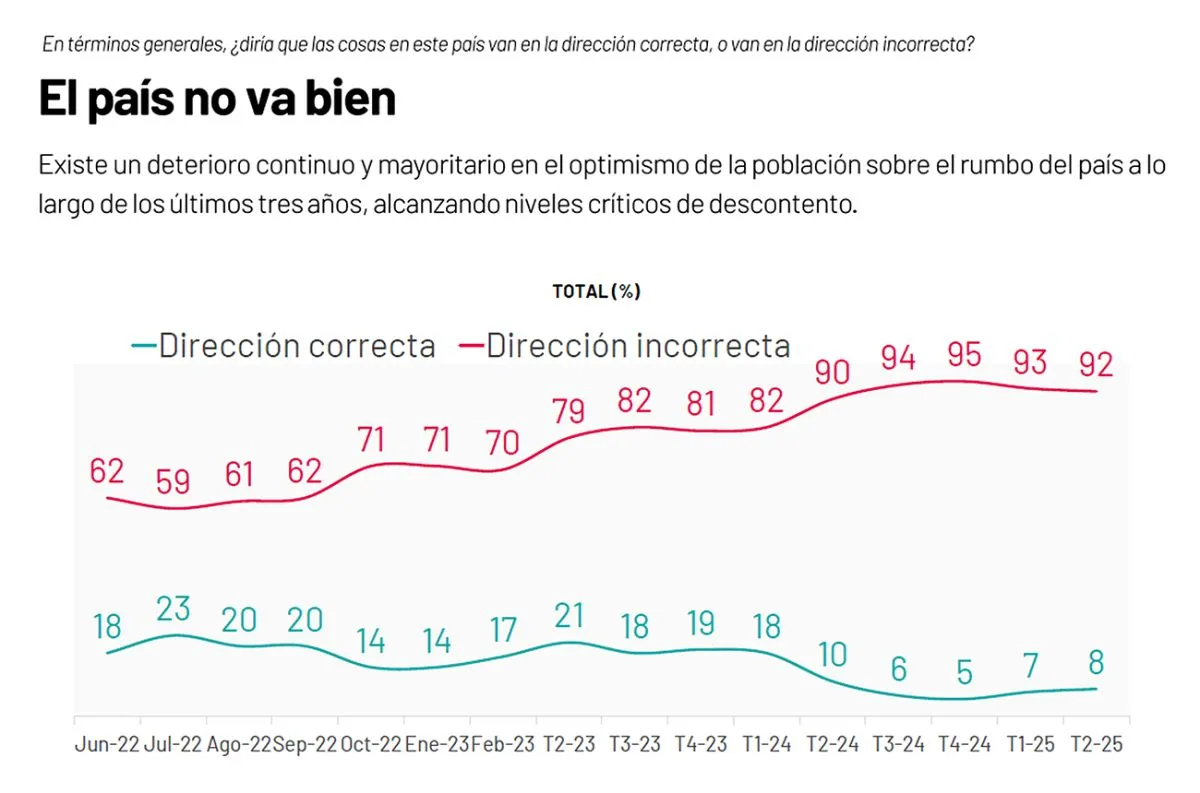Según la encuesta de Ipsos Ciesmori, hay un deterioro continuo y mayoritario en el optimismo de la población sobre el rumbo del país a lo largo de los últimos tres años, alcanzando niveles críticos de descontento.
