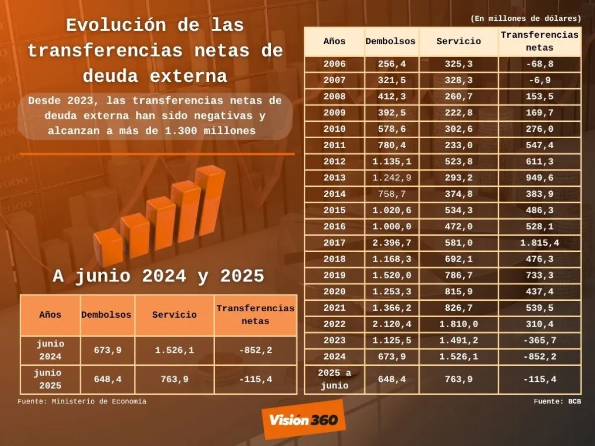 Según la autoridad, desde 2023, Bolivia registra un flujo neto negativo de divisas por el servicio de la deuda externa. “Los desembolsos actuales no compensan los pagos programados, lo que ha generado una salida neta de 1.333 millones de dólares entre enero de 2023 y junio de 2025”, precisó Montenegro.