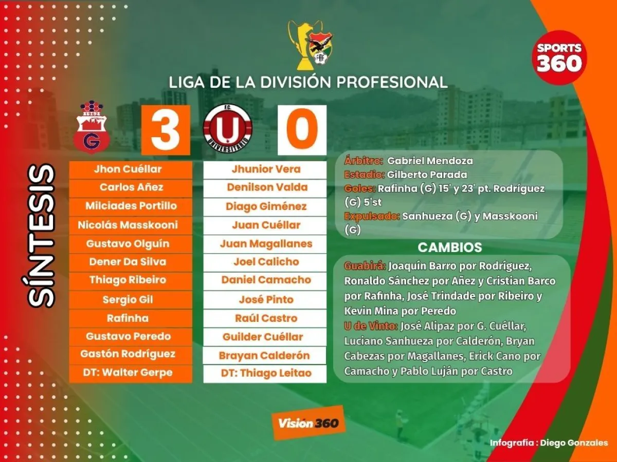 Guabirá no tuvo problemas en casa para ganarle con autoridad a Universitario de Vinto (3-0) y escaló seis posiciones en la tabla del torneo todos contra todos. Con 19 puntos quiere dar pelea para agarrar un premio internacional a fin de año.