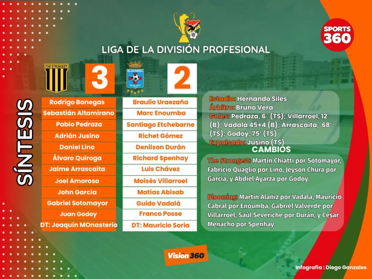 The Strongest sacó la garra y con uno menos derrotó a Blooming 3-2 este domingo en el estadio Hernando Siles y pasó a comandar en solitario las posiciones de forma provisional.