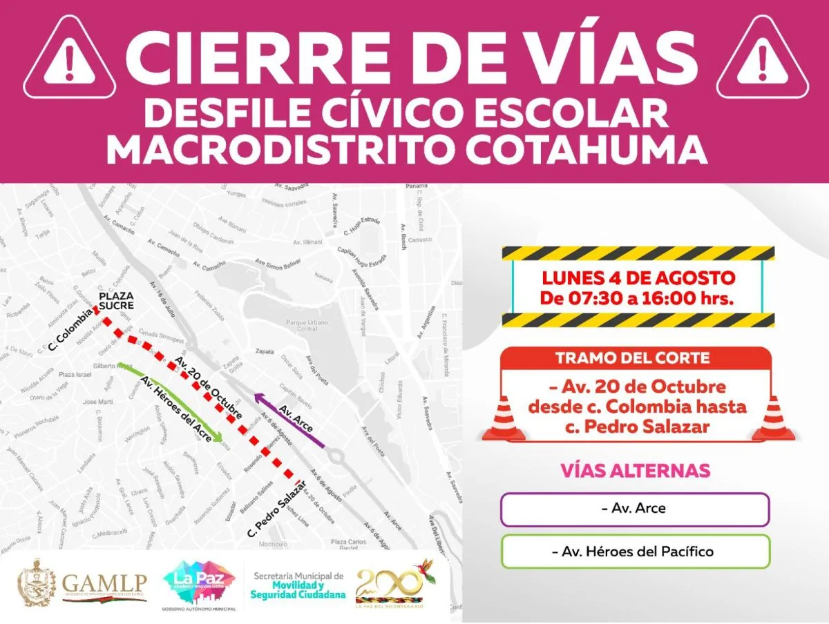 Entre este lunes 4 y mañana 5 de agosto, en al menos seis macrodistritos del municipio de La Paz se cerrarán vías por los desfiles escolares en homenaje al aniversario de Bolivia, que este año celebra sus 200 años de independencia.