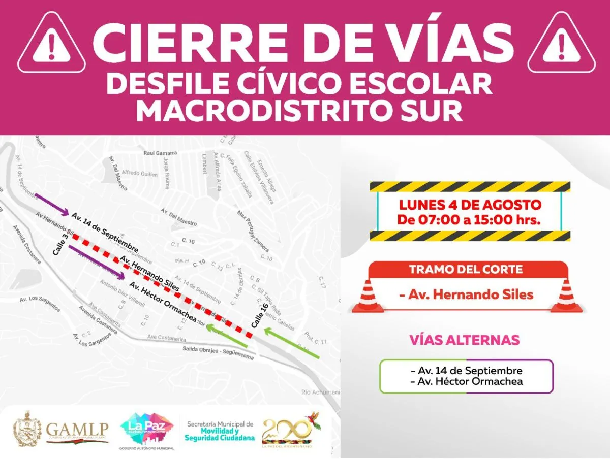 Ante el cierre de la avenida Hernando Siles por el desfile cívico, en el macrodistrito Sur, las vías alternas que estarán habilitadas para los vehículos son las avenidas 14 de Septiembre y Héctor Ormachea.