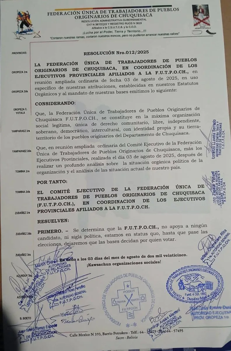 “Se determina que la FUTPOCH no apoya a ningún candidato, ni sigla política, estamos en status quo, hasta que pasen las elecciones. Dejaremos que las bases decidan por quién votar”, reza el artículo primero de la resolución aprobada por FUTPOCH, en un ampliado realizado el 3 de agosto en Sucre.