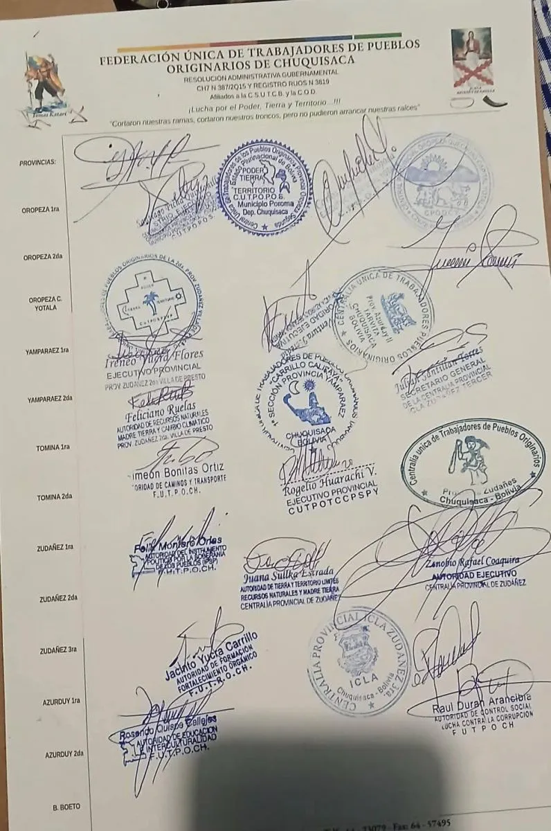 La Federación Única de Trabajadores de Pueblos Originarios de Chuquisaca (FUTPOCH), resolvió retirar su respaldo al candidato presidencial Andrónico Rodríguez, de la Alianza Popular; “no apoyamos a ningún candidato, ni sigla política”, dijo la entidad en su determinación. La decisión se suma a la advertencia de los campesinos de La Paz, que exigen además que el candidato cambie a su acompañante, Mariana Prado.