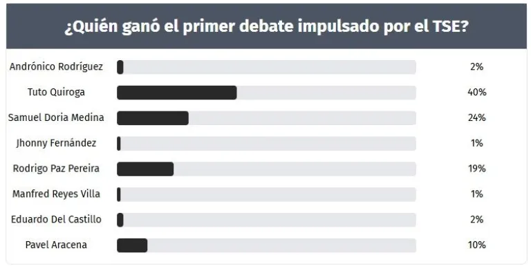 El 40% de quienes respondieron a la encuesta eligieron a Quiroga como el ganador, seguido de Samuel Doria Medina, de la alianza Unidad, con el 24% de respaldo. En el tercer lugar aparece Rodrigo Paz Pereira, del Partido Demócrata Cristiano (PDC) con el 19% y cuarto Pavel Aracena, de Acción Democrática Nacionalista, con 10%.