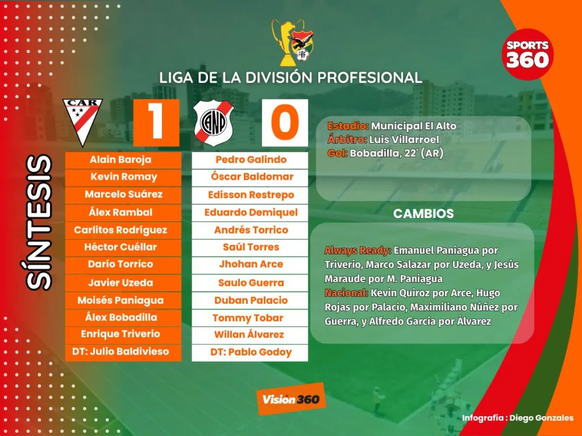 Always Ready podía ganar a Nacional Potosí por una mayor diferencia por las situaciones de gol que generó, pero se conformó con un triunfo por la mínima diferencia, este lunes en el estadio Municipal El Alto, en Villa Ingenio, por la decimosexta jornada de la Liga.