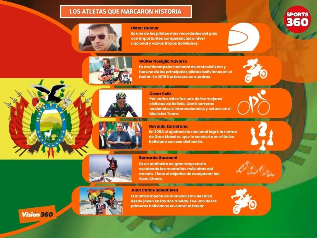 El Gran Maestro (GM) Osvaldo Zambrana (en el ajedrez); Wálter Nosiglia Navarro y sus hijos Daniel y Wálter Junior, además de Juan Carlos Salvatierra (motociclismo); los hermanos Marco y Bruno Bulacia (automovilismo); Ángela Castro (marcha); y Héctor Garibay (fondo) son otros destacados.