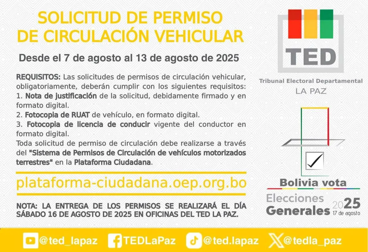 Los requisitos deben presentarse a través del "Sistema de Permisos de Circulación de vehículos motorizados terrestres" en la Plataforma Ciudadana, que se encuentra en el siguiente link: plataforma-ciudadana.oep.org.bo la cual estará habilitada desde este jueves.