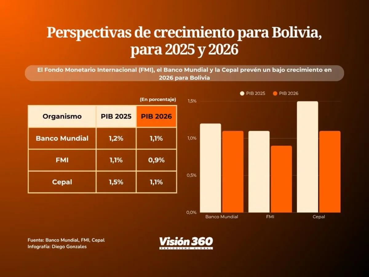 La Comisión Económica para América Latina (Cepal) en su informe presentado esta semana “Estudio Económico de América Latina y el Caribe 2025, proyecta para Bolivia un crecimiento económico de 1,5% este año y una desaceleración a 1,1% en 2026. Por su lado, el Banco Mundial anticipó en junio que la economía del país solo se expandirá en 1,2% este 2025 y caerá a 1,1% en 2026 y en 2027. El Fondo Monetario Internacional (FMI), en abril, en sus perspectivas para la economía mundial prevé que el PIB boliviano este año crecerá 1,1% y en 2026 la tasa disminuirá a 0,9%.