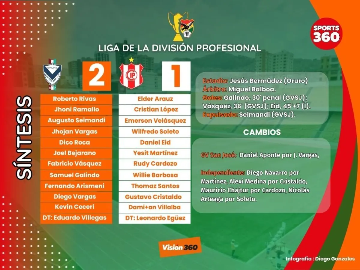 GV San José se reencontró con la victoria, después de tropiezos consecutivos. Le ganó 2-1 a Independiente en Oruro y conservó el quinto lugar de las posiciones de la Liga de la División Profesional, que por ahora lo mantiene en zona de clasificación a copas internacionales.